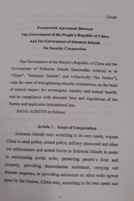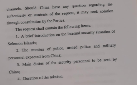 比如,下面这两张图,是今年3月被人在网上“泄露”出来的“草案”中涉及“合作范围”的内容。尽管这些内容的真实性并没有得到中方或所方确认,但即便从这份“草案”本身的内容来看,其中提到的中所安全合作的范围,也不过是 “维护社会秩序”“保护人员生命和财产”“提供人道主义援助”,以及“灾害应对”等非军事方面的内容。该“草案”还清楚地写到了合作是以所国自己的需求为核心的,只有当所国需要并向中国提出申请,中方才会派人来所国。因此,虽然该“草案”的“合作范围”还提到了中国派船只到访所国进行补给与中转这样的内容,但也明确写了这需要得到所国这个主权国家的允许才行。